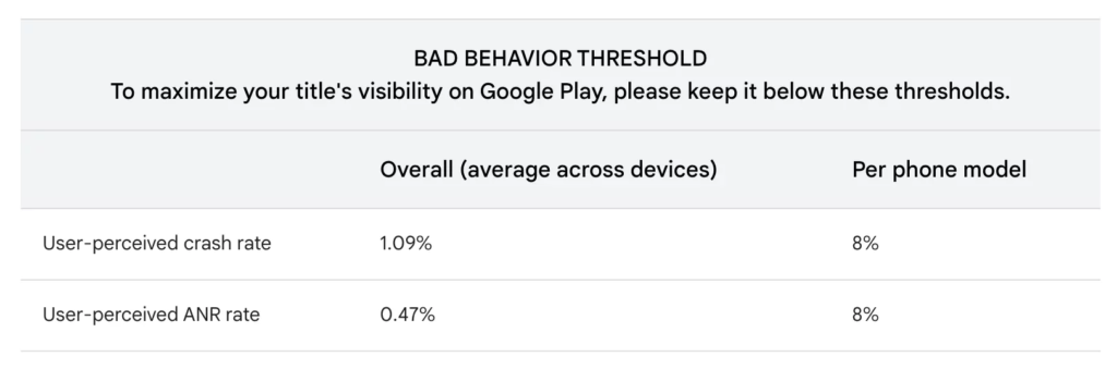 To maximize the visibility of your app in Google Play, keep the user-perceived crash rate below 1.09% across all devices and 8% per device, with the user-perceived ANR rate below 0.47% across all devices and 8% per device.
